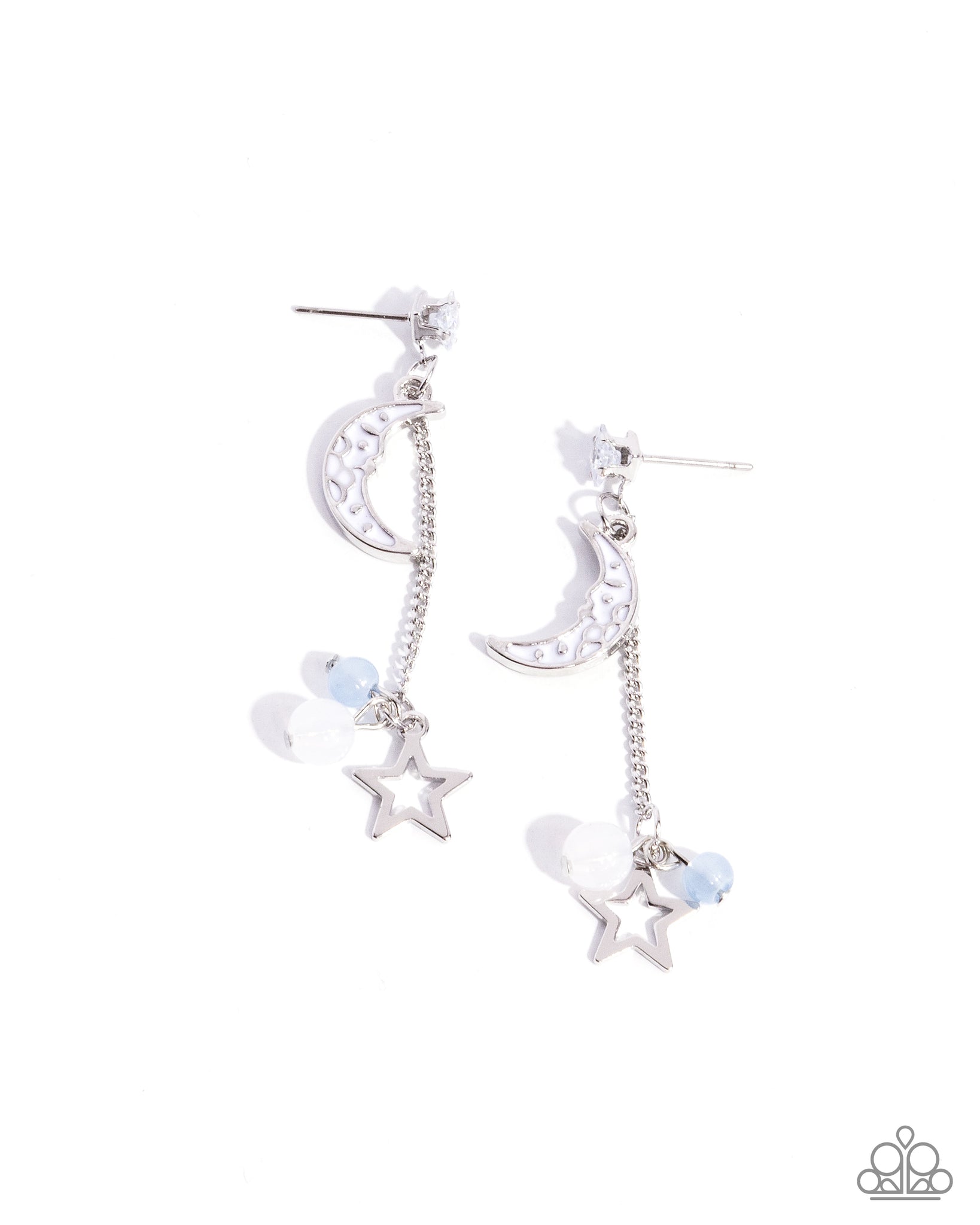 Pronged in dainty silver fittings, a white square gem is tilted on a point, giving way to a white-painted, silver-outlined detailed crescent moon which then gives way to a classic silver chain for a cosmically chic lure. Milky white and blue beads in varying sizes are suspended above a silver star silhouette that swings from the bottom of the classic chain strand for a starry finish. Earring attaches to a standard post fitting.