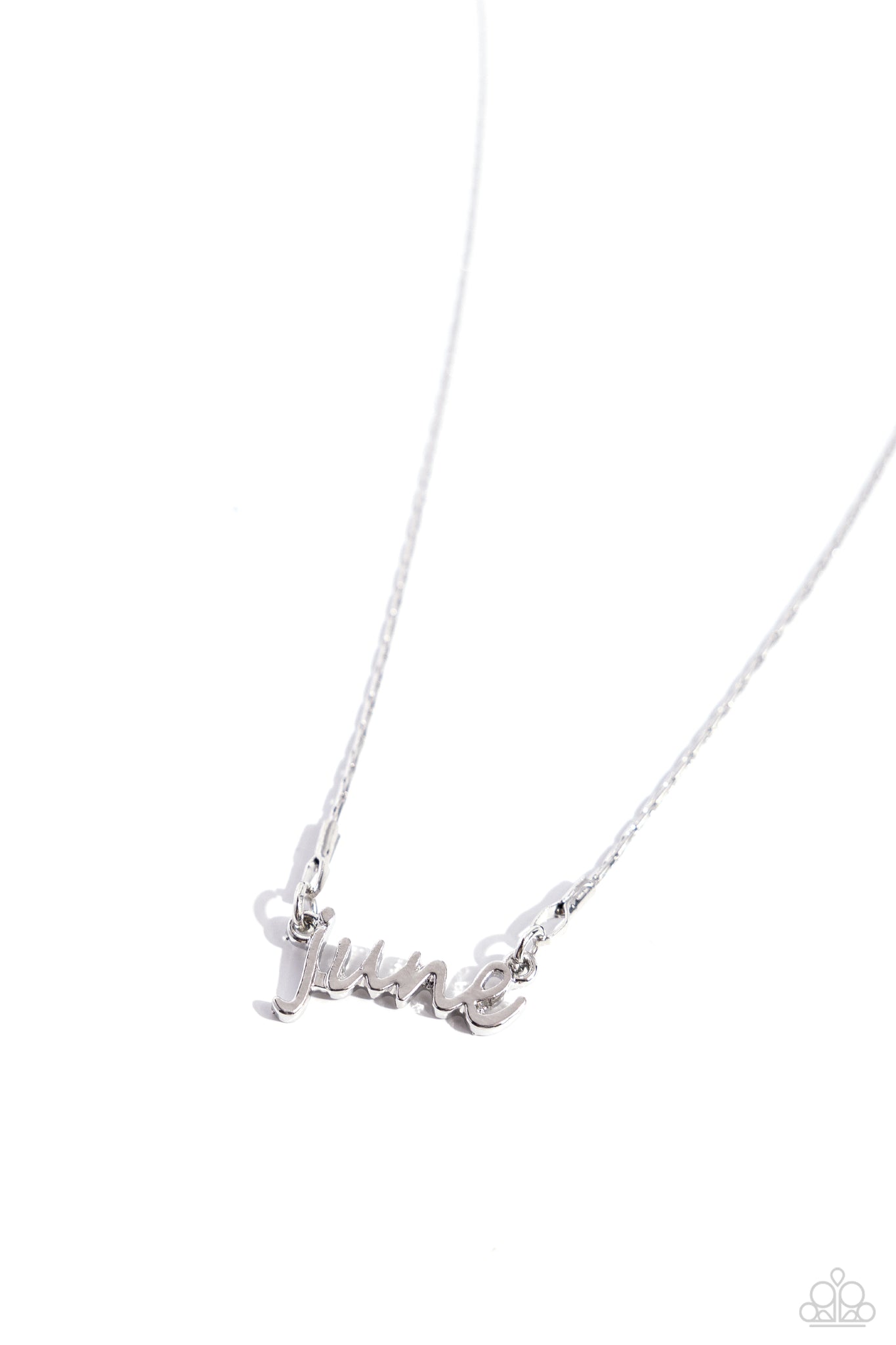 Featuring a cursive font, the word June is set in the center of an abstract silver chain for a birth month-inspired simple statement. Features an adjustable clasp closure.