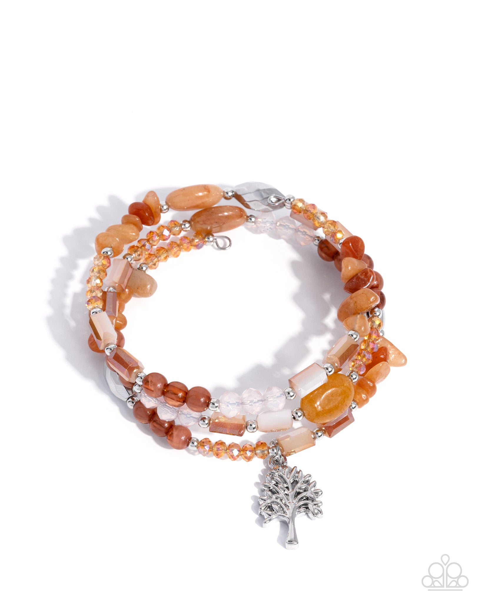 Threaded along a coiling wire, a collection of chiseled orange stones in varying shapes, Bran cloudy acrylics, silver accents, UV-shimmery orange beads in varying shapes, and faceted pink beads pattern and coalesce around the wrist, creating a colorful infinity wrap style bracelet. A glistening silver tree charm sways from the center of the display for a natural finish. As the stone elements in this piece are natural, some color variation is normal.