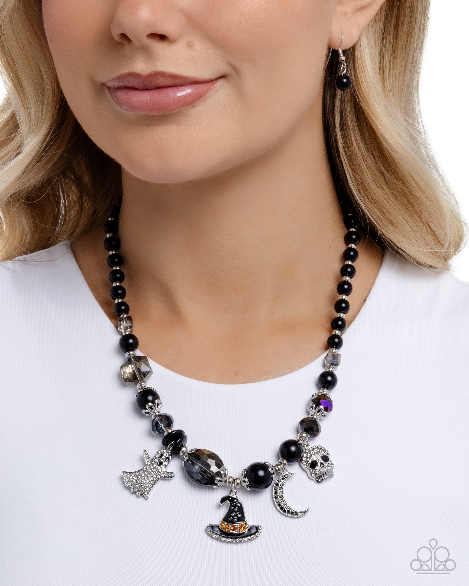 Infused along an invisible string, a collection of polished black beads and discs, silver studs, silver floral cap fittings, and smoky UV-shimmery beads in varying cuts patterns below the neckline for a grungy display. A collection of Halloween-inspired charms, including a white rhinestone-dusted ghost with black-painted detailing, a black rhinestone-dusted silver crescent moon, a white rhinestone-dusted silver skull with black-painted detailing, and a white and yellow rhinestone-dusted, black-painted witches hat with black studded detailing, sway in between the dark beads for a spooky finish. Features an adjustable clasp closure.