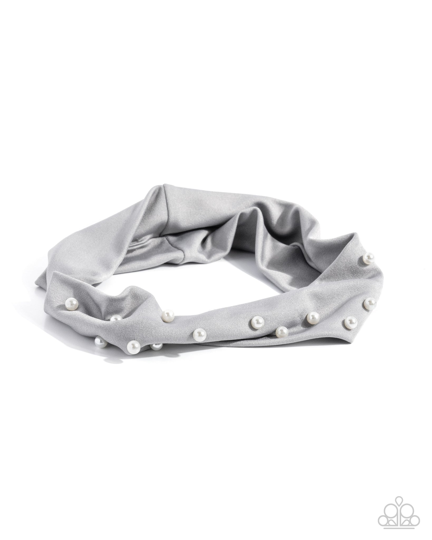 Sporadically dotted with glossy white pearls, a soft gray fabric headband rests atop the head, evoking a polished, preppy look.