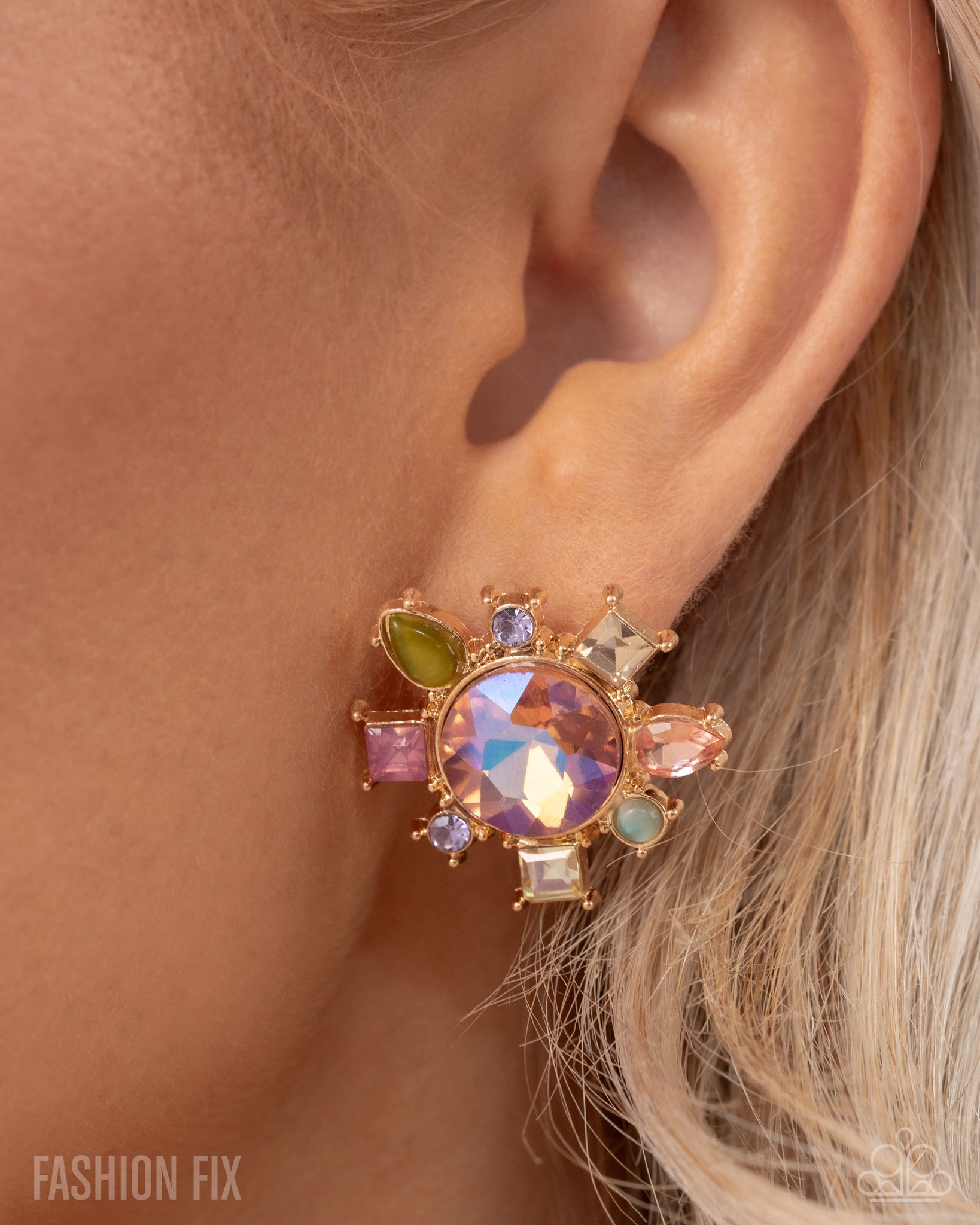 Crackling with vintage incandescence, a sparkly collection of round, teardrop, and square gems and rhinestones in varying shades and opacities scatters around an oversized UV-shimmery peach gem in gold-pronged fittings for a jaw-dropping dazzle. Due to its prismatic palette, color may vary. Earring attaches to a standard post fitting.