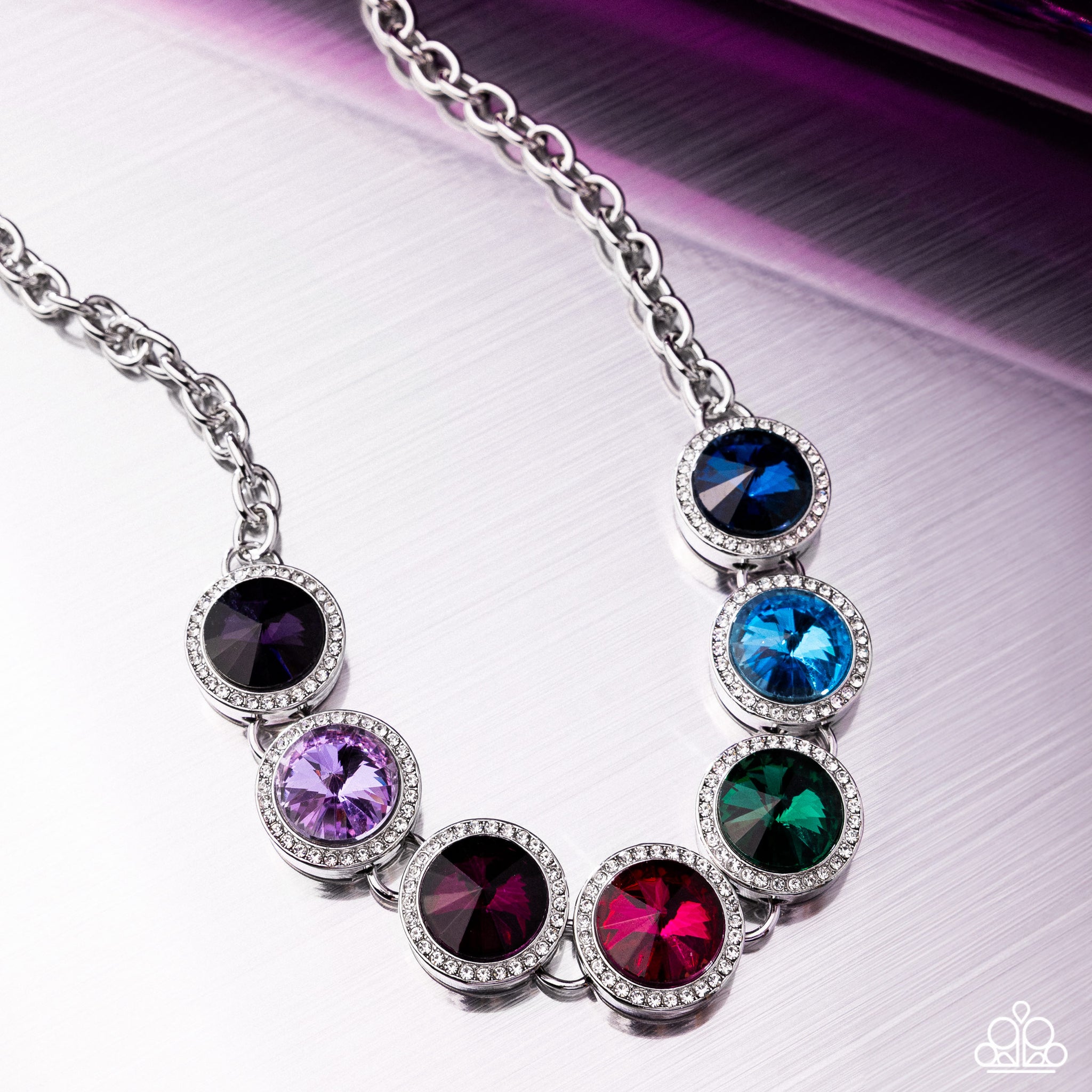 Encased in sleek white rhinestone-dusted silver frames, faceted round multicolored gems shimmer below the neckline from a glistening silver chain for a colorfully chic look. Features an adjustable clasp closure.